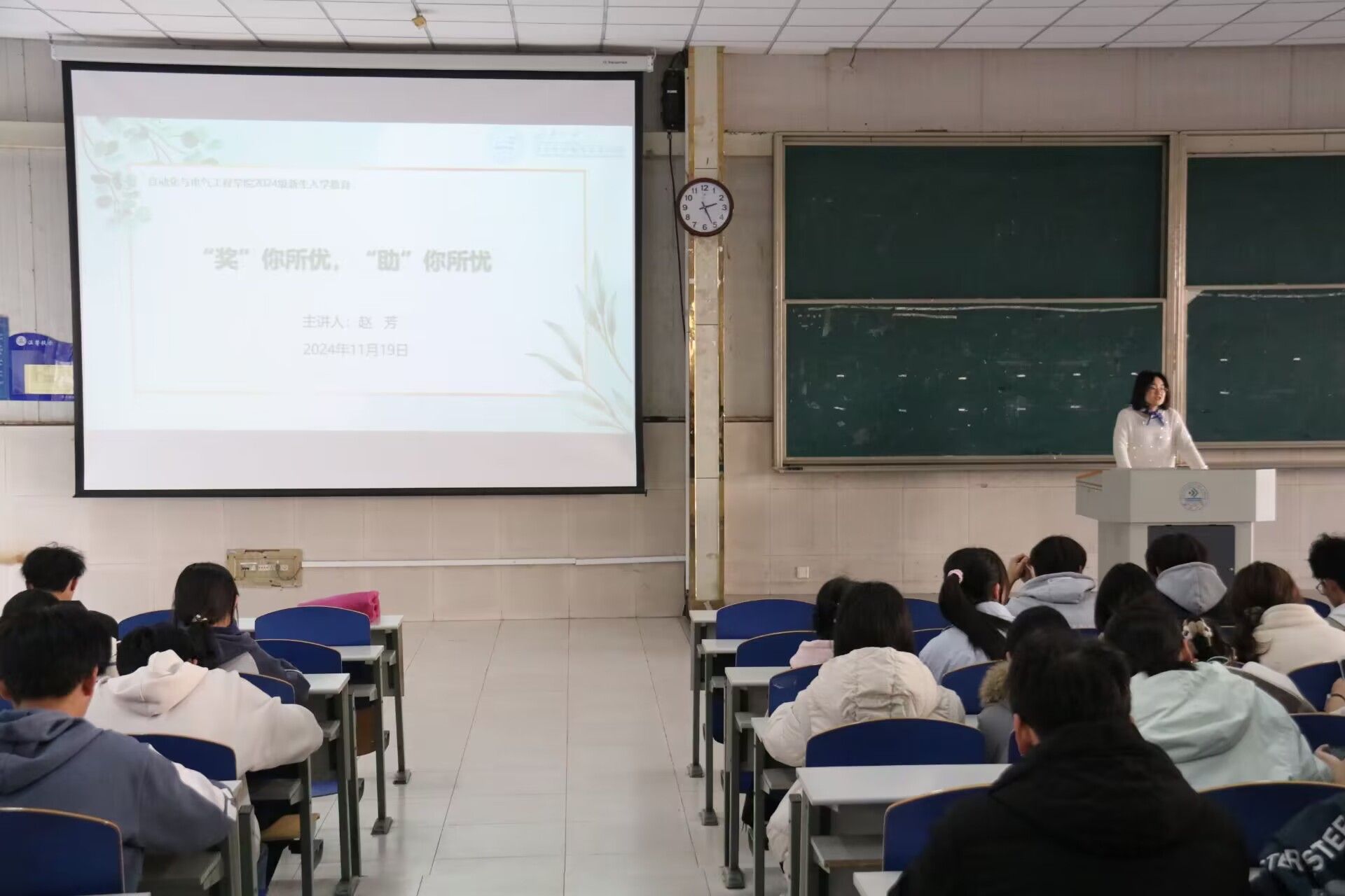 资助工作负责人赵芳以《“奖”你所优,“助”你所忧》为题面向2024级新生开展入学教育,进行奖助政策宣传。