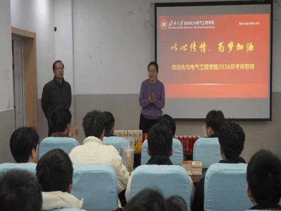 在第一教学楼地下报告厅举办2026届考研慰问活动。学院党委副书记、副院长张琦,2022级辅导员赵芳出席活动。