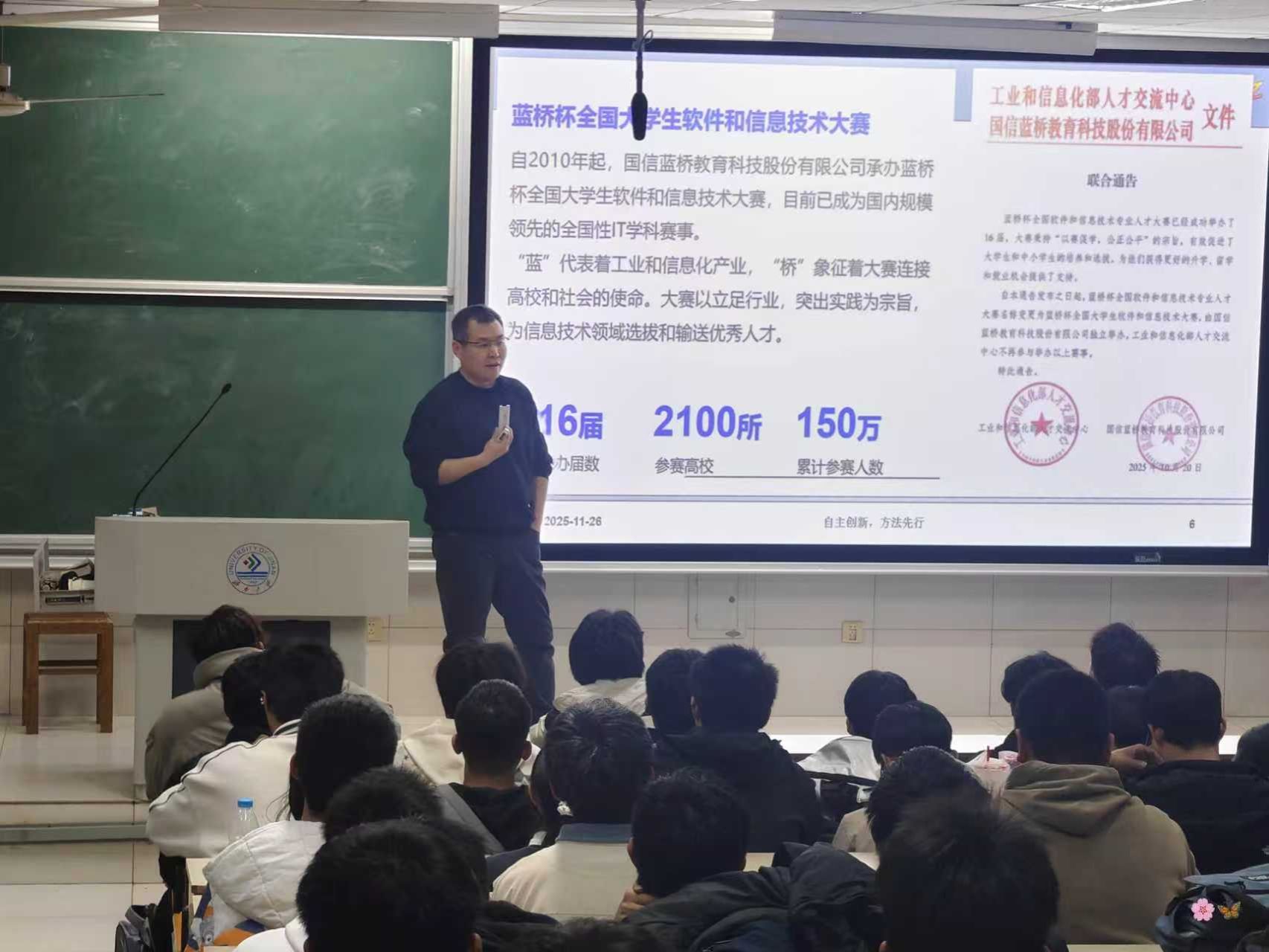 科创不仅是课堂学习的延伸,更是将书本知识转化为实际问题解决方案的“练兵场”。本次科创赛事宣讲会的举办,不仅为学生搭建了科创赛事与实践能力对接的桥梁,让“蓝桥杯”等科创赛事从“陌生概念”变为“可参与、可突破的目标”;更以名师、朋辈经验分享为切入点,激发了学生将理论知识转化为创新成果的动力,为电子赌博