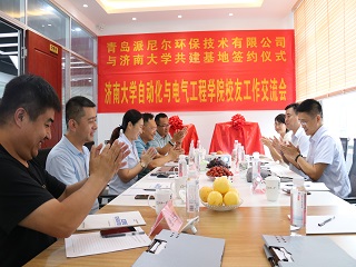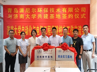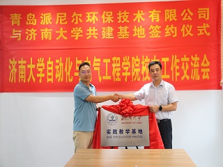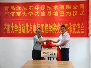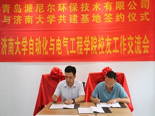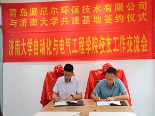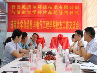 校友交流会暨基地签约揭牌仪式在青岛派尼尔环保技术有限公司举行。山东中天人和教育科技发展有限公司董事长、济南大学青岛校友会、自动化学院青岛校友会会长贺丰彬, 青岛派尼尔环保技术有限公司总经理陈勇、常务副总苏焱芳,青岛鲁捷信通能源技术有限公司总经理张召强,青岛奇点生物有限公司总经理谷田,电子赌博
