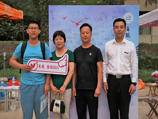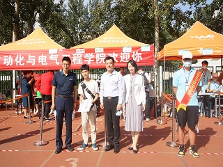 党委书记夏卫东,院长崔焕勇,副书记、副院长陈春锋等院领导在迎新工作站进行工作指导,与学生家长交流。中午阳光灼人,迎新工作人员穿着天蓝的院服,仍旧微笑着解答新生的各种问题,成为了一道亮丽的蓝色风景线。