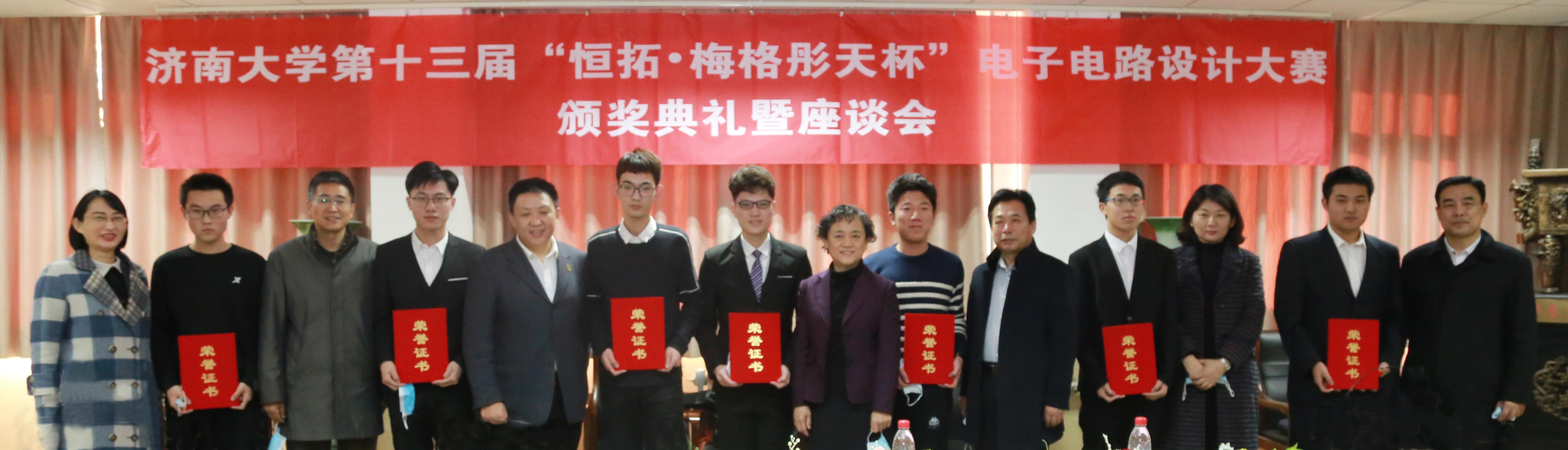 12月24日,济南大学第十三届“恒拓•梅格彤天杯”电子电路设计大赛颁奖仪式在第一教学楼1108会议室举行。济南大学党委副书记张硕秋,济南大学教授、山东恒拓科技发展有限公司专家孟庆金,山东梅格彤天电气有限公司执行总裁谷青松,济南大学团委书记孙菲菲,电子赌博