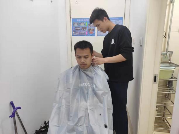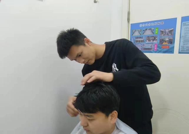 2022年3月30日,驻济高校疫情防控形势严峻,学校果断实施了校园物理隔离措施,学院有许多同学的生活范围被限制在教学二区,该区域暂无理发店开设。为满足这些同学们的基本生活需求,在疫情之下,共克时艰的关键时期,支部党员白茂强同学主动站出来,积极参与志愿活动,义务为同学们理发。