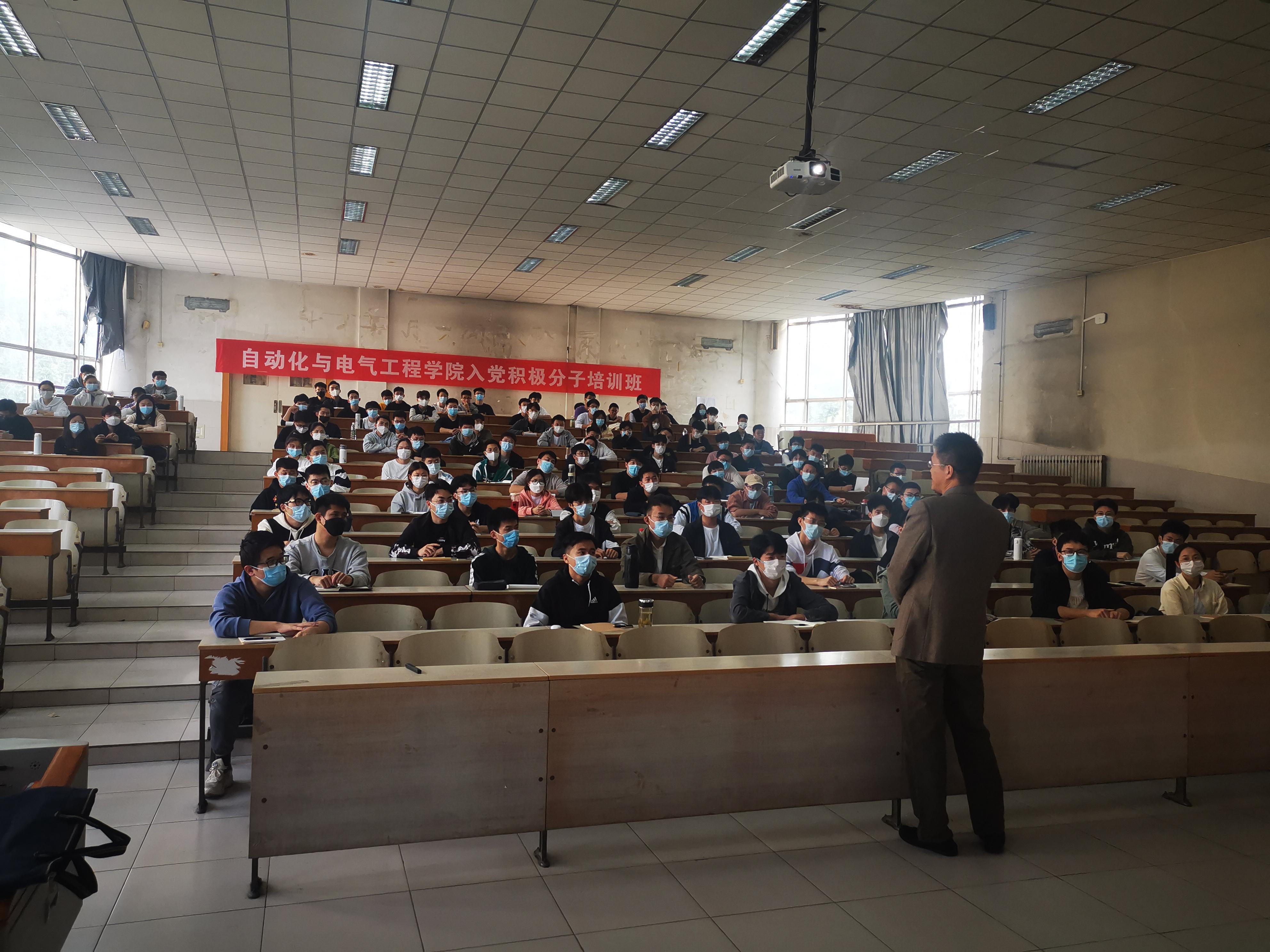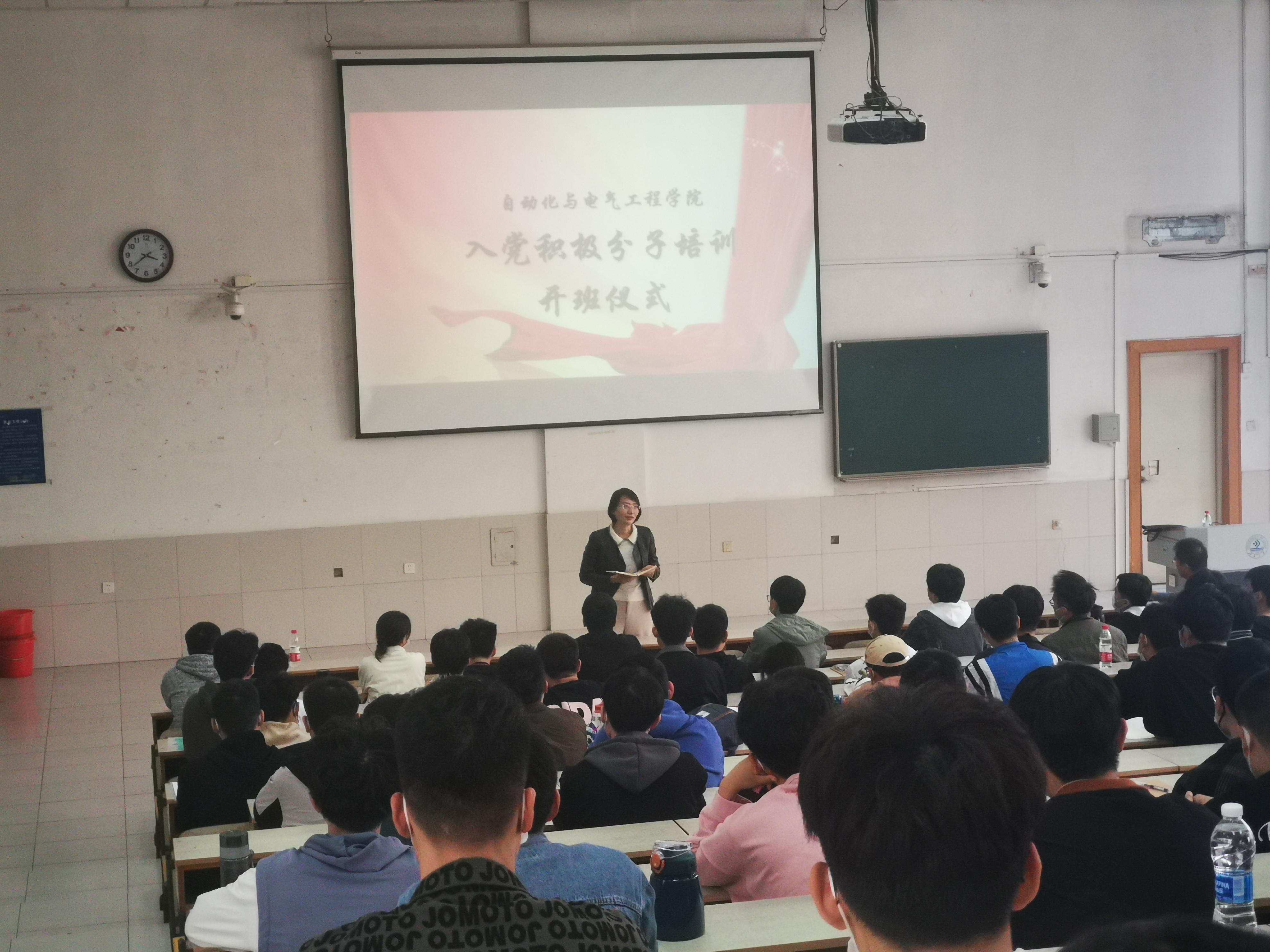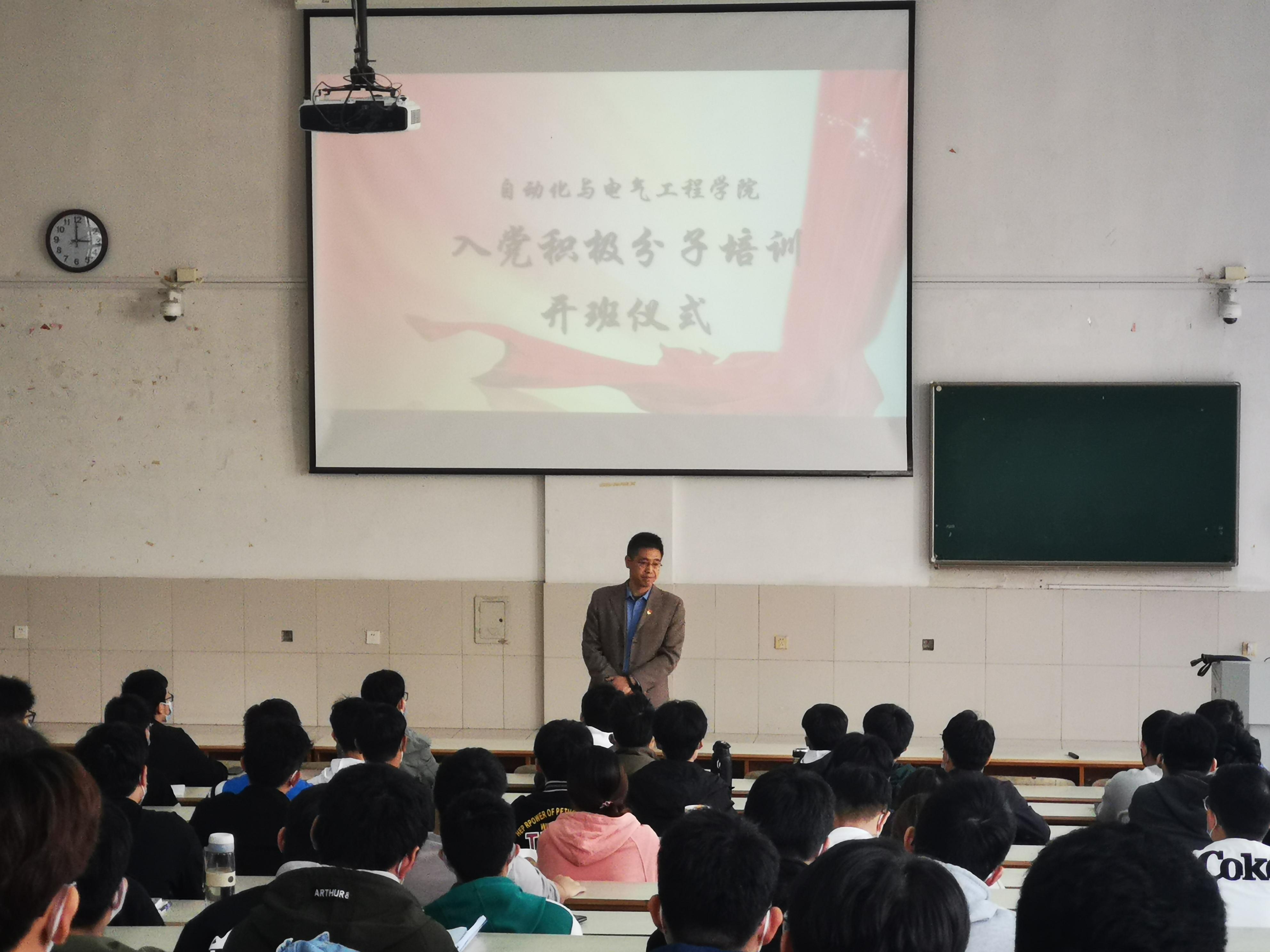 在开班仪式上,学院党委书记夏卫东作了动员讲话,对新确定的107名入党积极分子表示欢迎和祝贺。他指出,入党积极分子培训是提高党员发展质量的重要手段,是提升入党积极分子思想政治觉悟和理论水平重要抓手,是保持党组织先进性、纯洁性的重要保障。结合这次培训班的计划安排、学习内容、实践要求等情况,夏卫东书记对培训班和全体学员大家提出了几点希望和要求:一是紧扣培训目的,牢记初心使命。参加培训的入党积极分子要树立正确的理想信念,进一步端正入党动机,严格按照党员的标准要求自己,争取早日成为党组织的一员。二是夯实培训内容,推进党的理论知识入脑入心。本期入党积极分子培训有专题讲座、专题课程、红色影片、讨论交流等环节,旨在加深入党积极分子对党的宗旨性质、党的发展历程和党的基本知识和基本理论等的了解。希望全体学员利用这次学习机会,让培训内容入脑入心。三是注重培训实效,引导入党积极分子做出表率。入党积极分子要通过积极参与疫情防控、帮助身边的同学等形式,从自我做起,从身边做起,切实发挥先锋模范作用,真正做到学以致用、知行合一,以实际行动践行党的初心使命和宗旨,争取早日成为一名光荣的中国共产党党员。