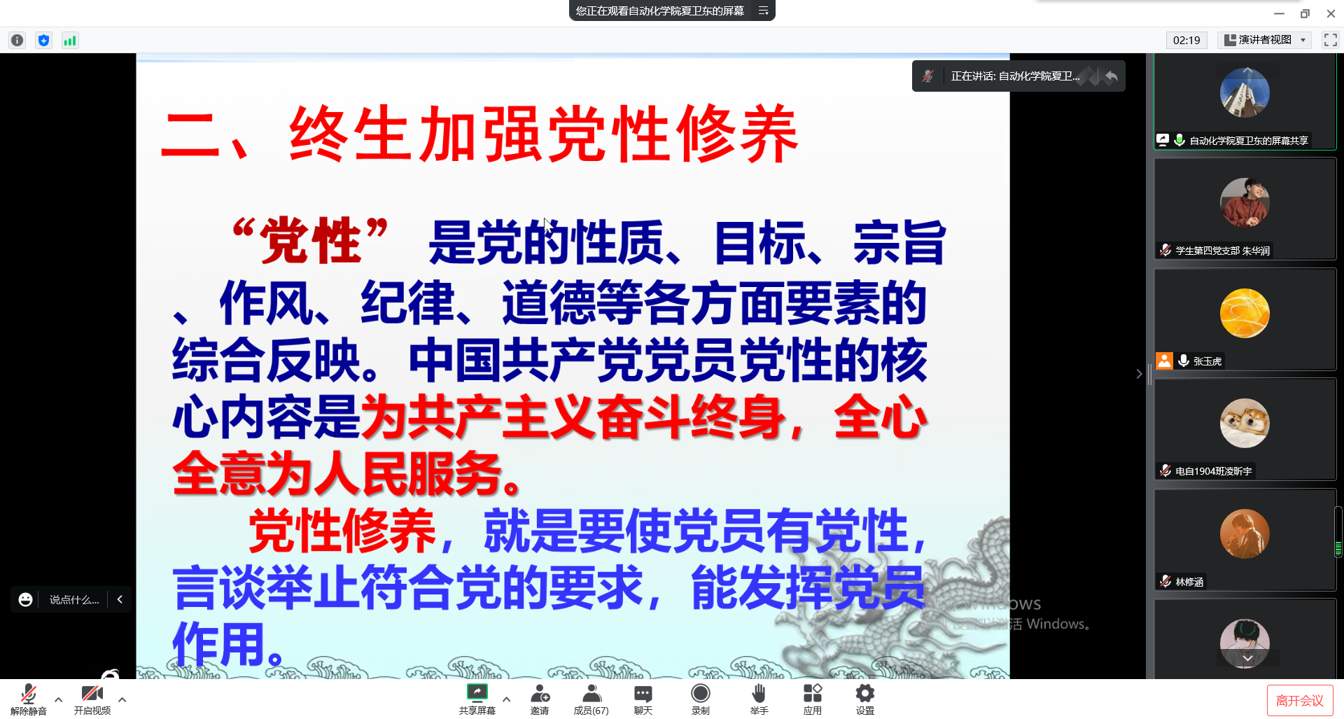 通过腾讯会议举办了2022年下半年预备党员转正培训,本学期转正的46名预备党员、各学生党支部支部委员、研究生兼职党支部书记、组织员等参加了培训。
