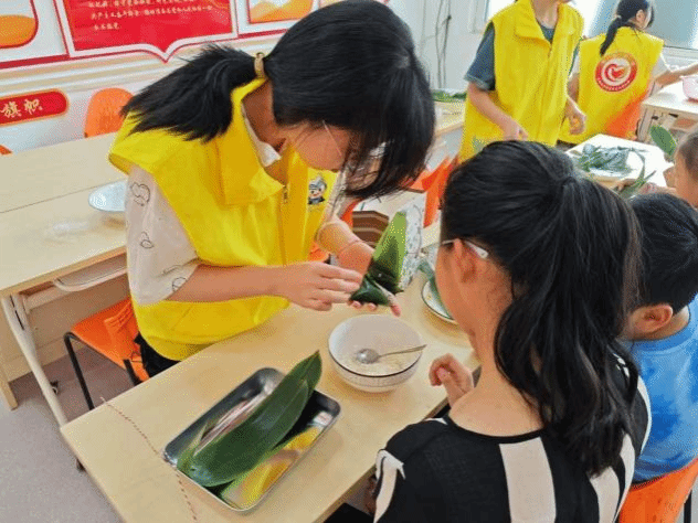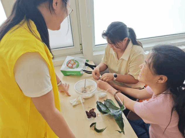 青年志愿者协会组织志愿者前往建南社区党群服务中心,协助社区开展“‘粽’情六一,‘童’造安康”粽子DIY活动,陪伴青少年体验传统文化,提升动手能力。