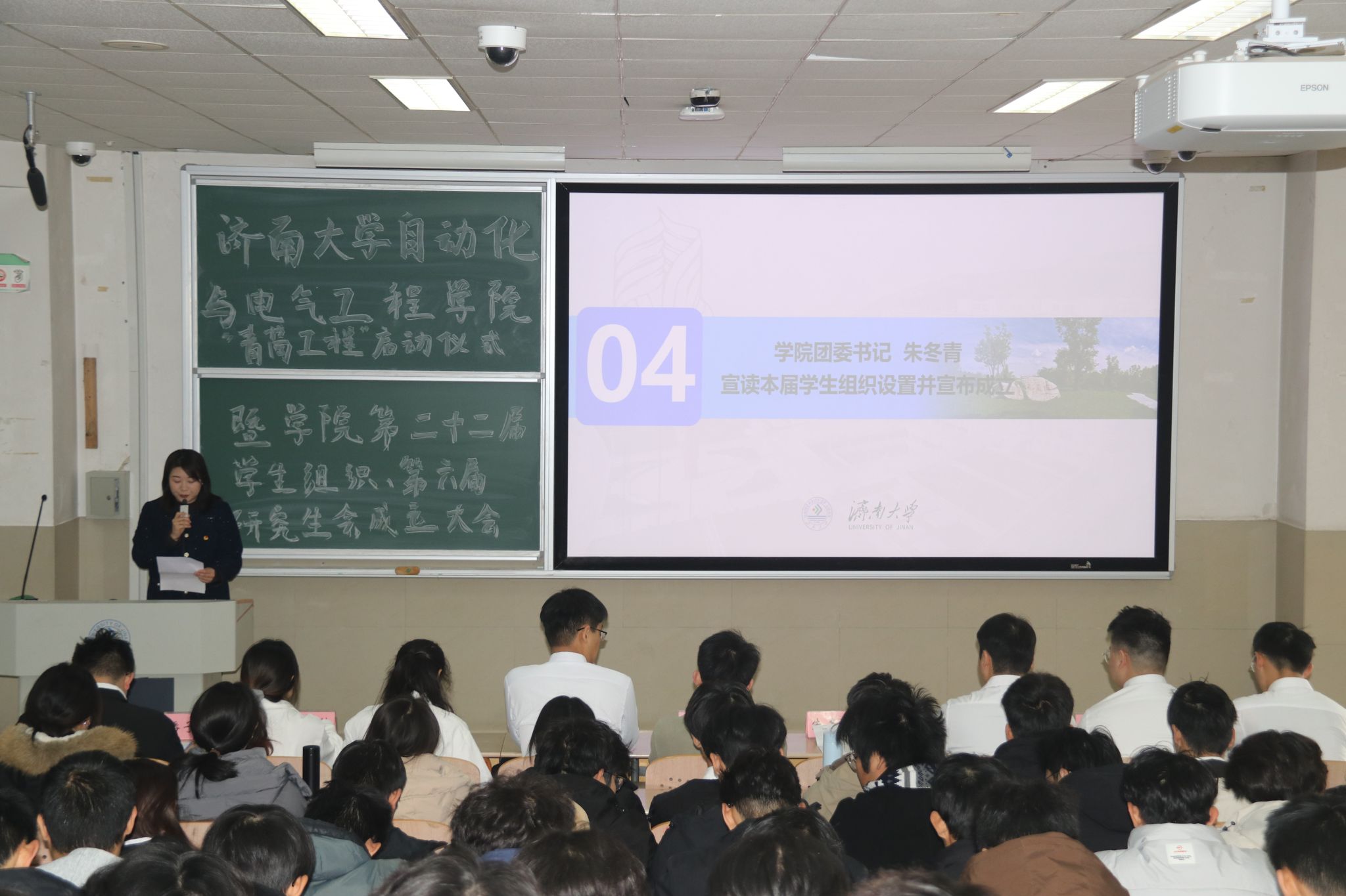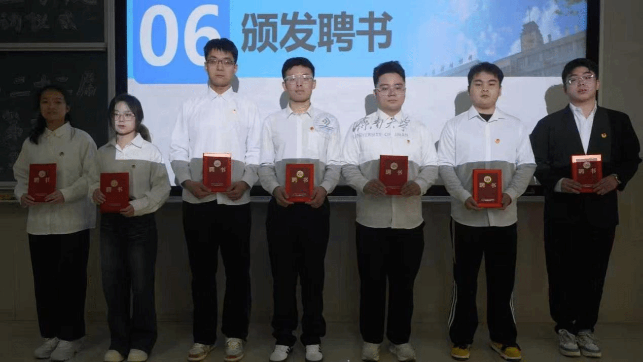 仪式现场还举行聘书颁发环节,以荣誉赋能责任,激励学生干部以更高标准践行使命。济南大学第十五期“青马工程”大学生骨干培训班六支部宣传委员秦文昊结合自身经历分享成长感悟,为学生骨干成长提供宝贵经验借鉴。