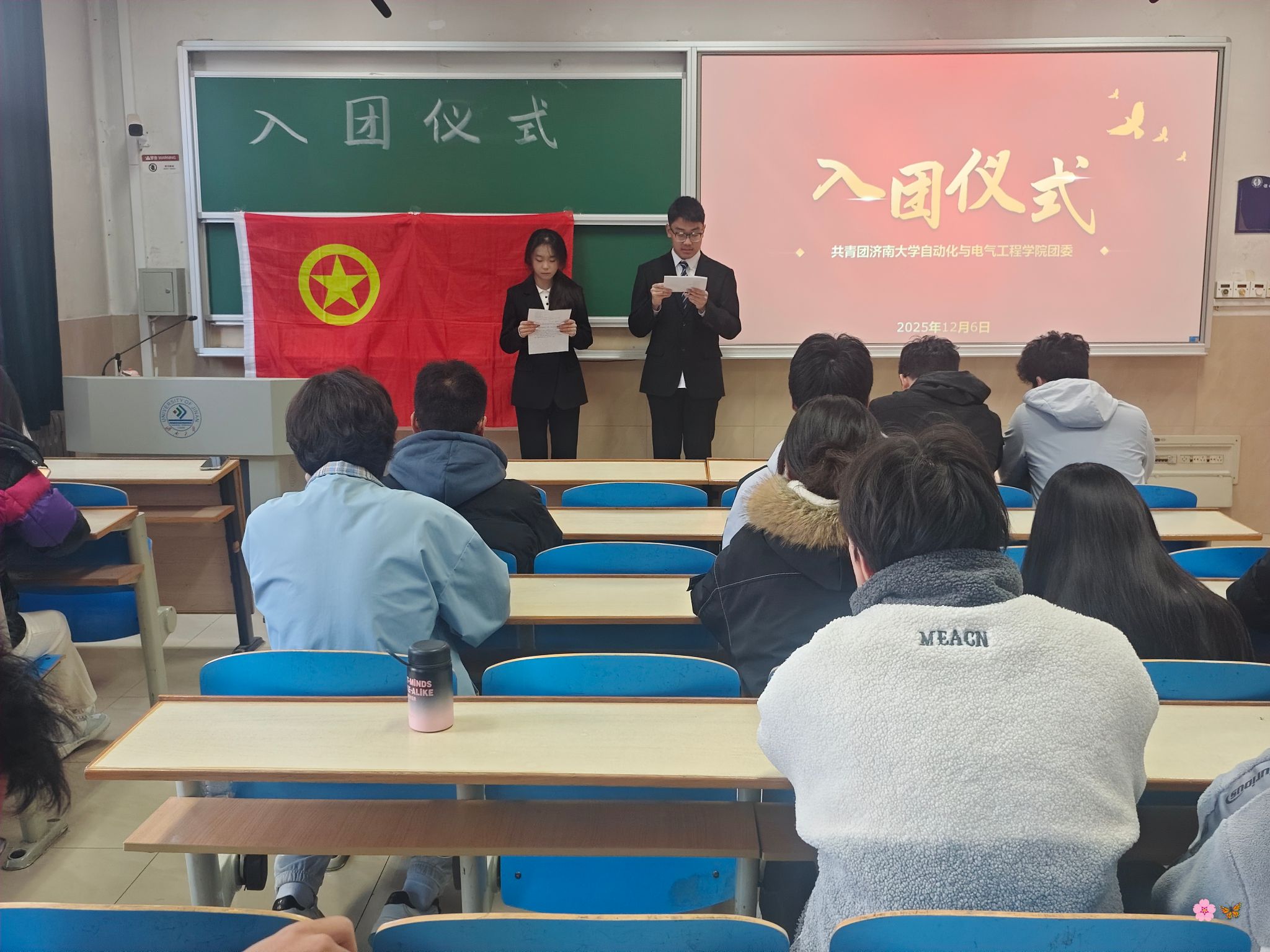 随后,主持人宣读新团员名单,老团员为新团员发放并佩戴团徽。新团员代表杨柳带领全体新团员面向团旗庄严宣誓,铿锵的誓言既是对“一二·九”先辈的致敬,更是对青春使命的承诺。