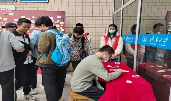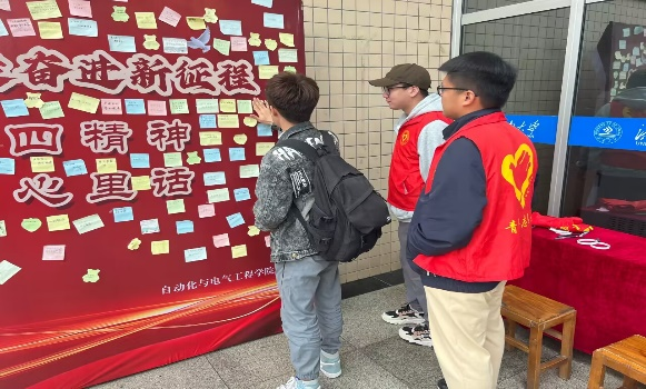 团委、研究生联合会在第一教学楼门口布置了“学习二十大、永远跟党走、奋进新征程,弘扬伟大的五四精神,对五四先辈的心里话”展板,研究生联合会在现场负责引导师生积极参与活动并维持现场秩序,各团支部积极主动配合,组织师生开展主题团日活动。现场聚集大量前来参加“学习二十大、永远跟党走、奋进新征程,弘扬伟大的五四精神,对五四先辈的心里话”活动的有志青年,他们怀着崇高的敬意,在便利贴上写下了对党的祝福和对伟大五四先辈们的缅怀及崇敬之意。一字一语,都表达了同学们深刻学习宣传贯彻党的二十大精神的决心,坚定不移跟党走的信念以及对伟大五四精神的弘扬和对五四先辈的崇敬之情。
