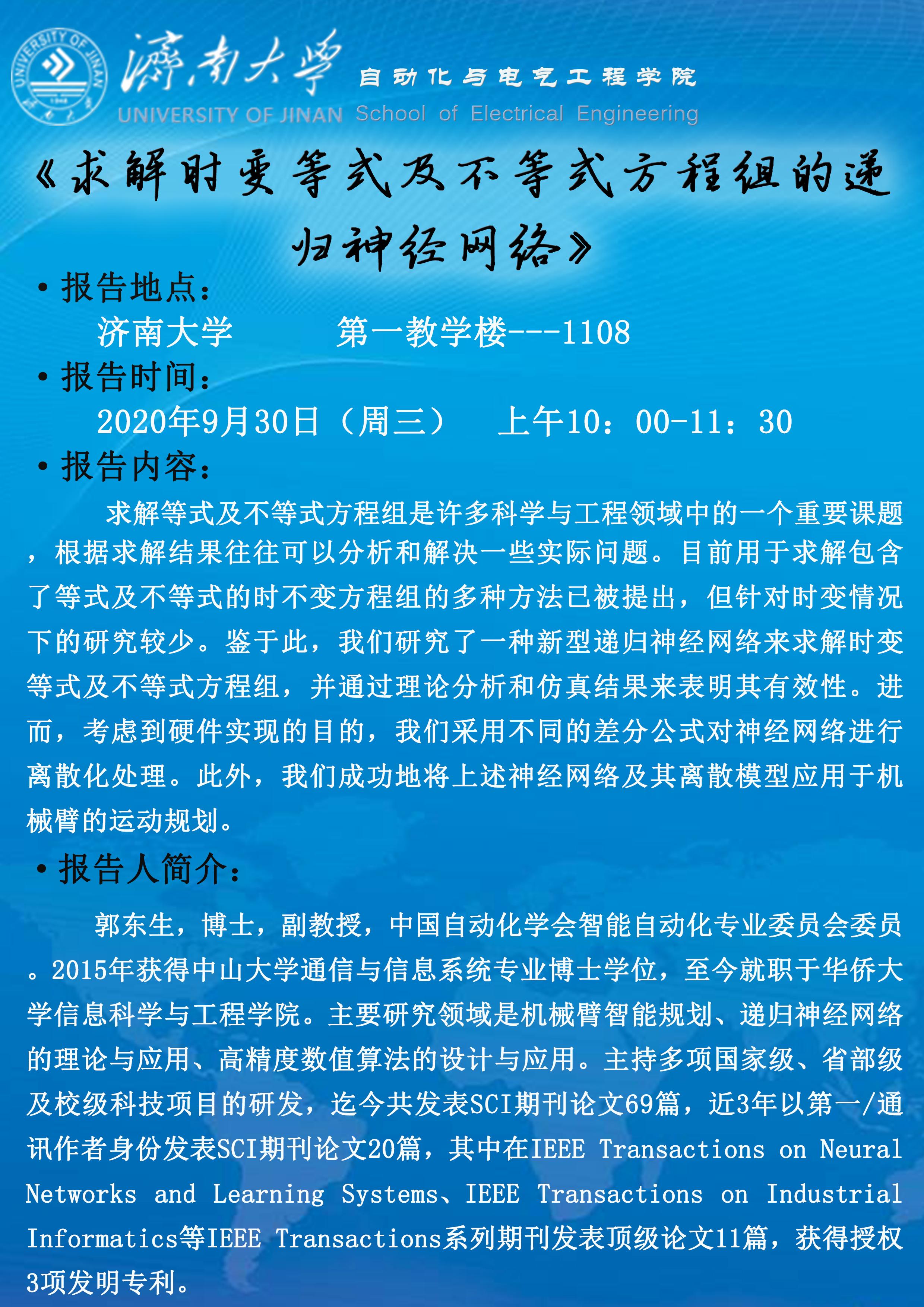 学术讲座:求解时变等式及不等式方程组的递归神经网络