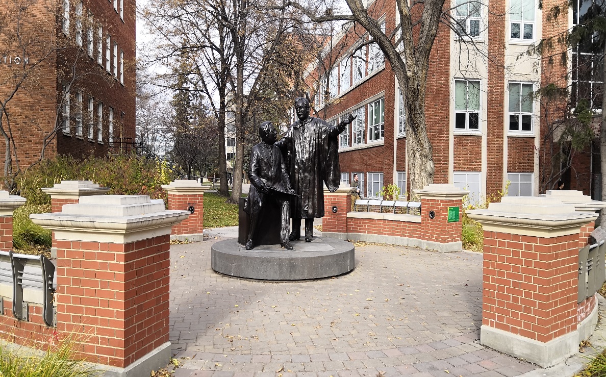 Fig.2 阿尔伯塔创始校长Henry Marshall Tory和时任阿尔伯塔省长在一起筹划学校未来的塑像(周围红墩子之间刻着历任校长的姓名和任期)